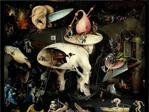 Not as scary as his Hell paintings, but don’t we expect Hell to be scary? This is the Garden of Earthly Delights, and this is creepy AF! What’s up with all the Keebler elves sewing together human parts? Is that a witch, overseeing the work, casting a spell or a representative of the mind? Are they making a woman? I have so many questions, so many, and no one has answers.