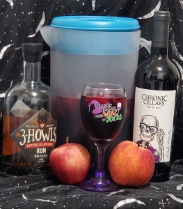 Ingredients: 2 bottles of red wine (Red blends and Cabernets work best) 1/2 cup – spiced rum 1 can – Sprite (or Tangerine LaCroix) 1/2 cup – sugar Assorted sliced fresh fruit