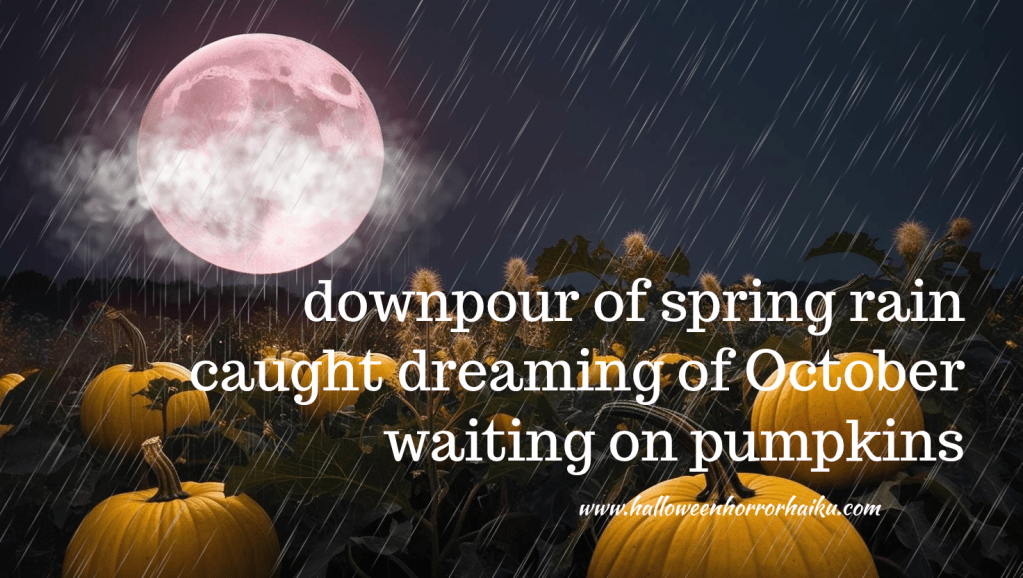 downpour of spring rain caught dreaming of October waiting on pumpkins