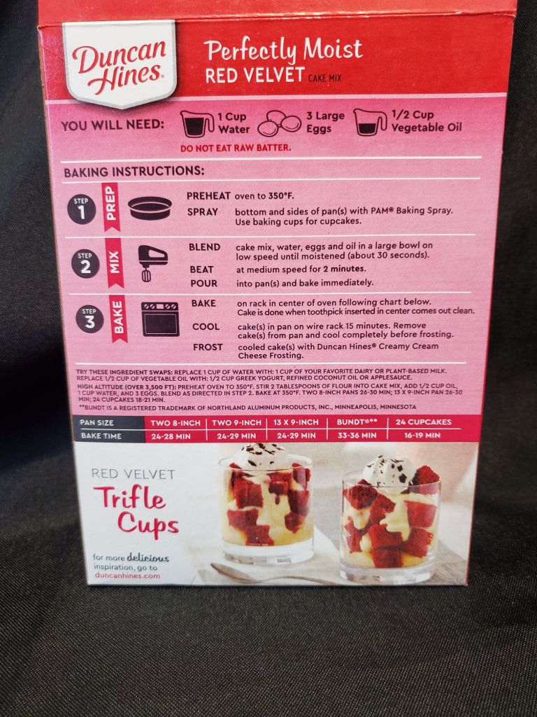 First thing you need for box cake is box mix and I prefer Duncan Hines Perfectly Moist Red Velvet cake mix. This is the easiest cake mix, only 3 other ingredients are needed to bake the cake, 1 cup of water, half cup of oil, and 3 eggs.