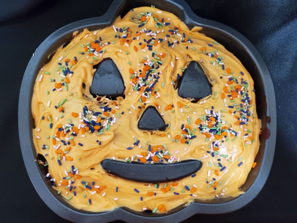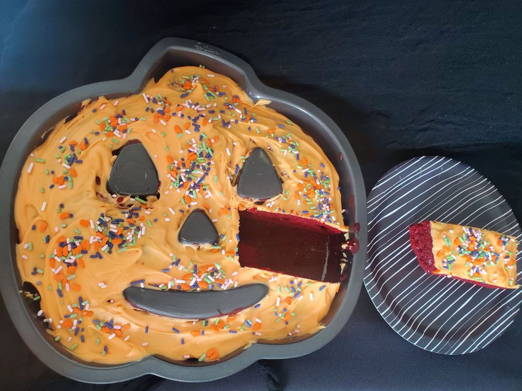 It was a bummer the Red Velvet Tombstone Cakes didn’t turn out, but I was happy with the pumpkin cake pan version.