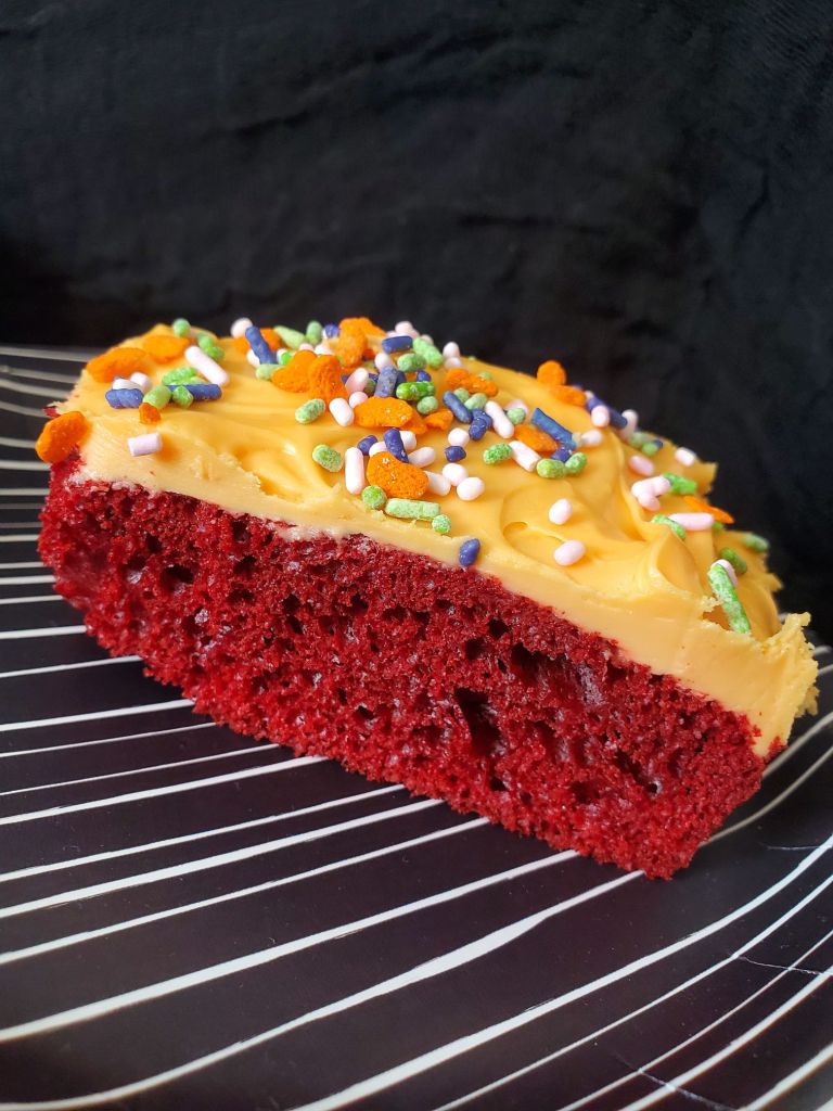 Yes, I used box cake. Middle finger to the haters. But the box cake wasn’t the reason why my Red Velvet Tombstone Cakes were a little well done, it’s just my inability to pull pan out of the oven when the box says!
